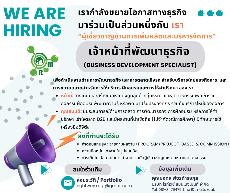 WE ARE HIRING! มาร่วมเป็นทีมเดียวกับเรา เพื่อการพัฒนาธุรกิจ และการตลาดเชิงรุก สำหรับบริการใหม่ และการขยายตลาดสำหรับการให้บริการ ฝึกอบรมและการให้คำปรึกษาด้านการผลิต การจัดการข้อมูล และการบริหารจัดการโลจิสติกส์ ตลอดซัพพลายเชย" ***ดูรายละเอียดและคุณสมบัติ***