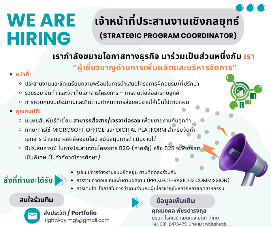 WE ARE HIRING! มาร่วมเป็นทีมเดียวกับเรา เพื่อประสานงานและจัดเตรียมความพร้อม การติดต่อสื่อสารกับลูกค้า สำหรับโครงการฝึกอบรม ให้คำปรึกษา ด้านการผลิต การจัดการข้อมูล และการบริหารจัดการโลจิสติกส์ ตลอดซัพพลายเชน" ***ดูรายละเอียดและคุณสมบัติ***