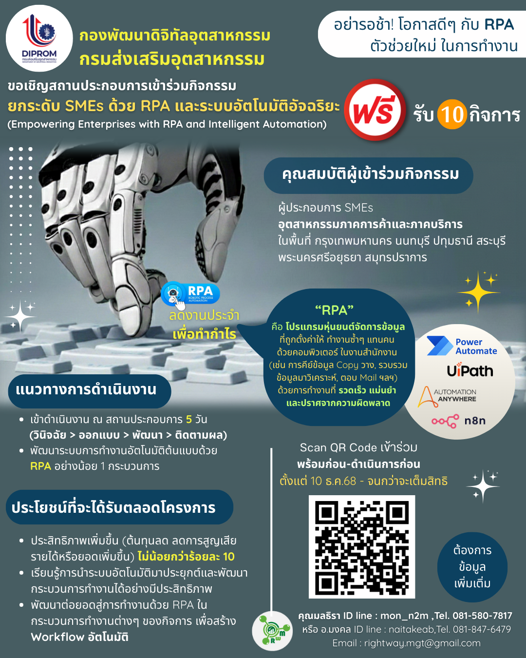 โอกาสดีๆ กับ RPA (Robotics Process Automation) ตัวช่วยใหม่ในการทำงานเอกสาร มาลดงานประจำ เพื่อทำกำไรกัน เข้าร่วมฟรีครับผม รับเพียง 10 กิจการ โดยได้รับการสนับสนุนจาก กองพัฒนาดิจิทัลอุตสาหกรรม กรมส่งเสริมอุตสาหกรรม